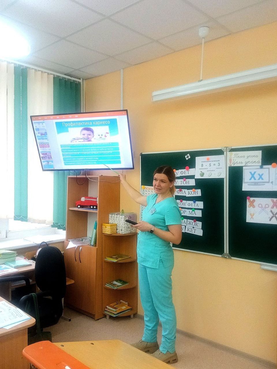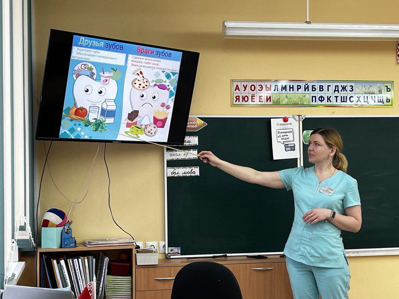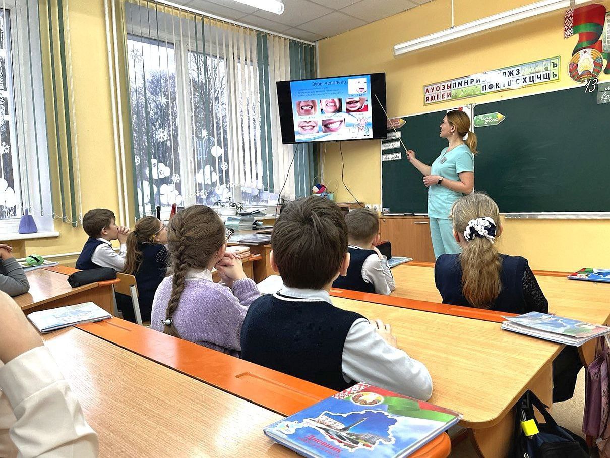 13 февраля 2024 в ГУО "Средняя школа №2 г.п.Бешенковичи имени Героя Советского Союза М.Н.Ткаченко" врач - стоматолог-ортопед Бешенковичской ЦРБ Ляшук Алеся Александровна провела лекцию для учеников 4 и 1х классов на тему "Здоровье и красота зубов".